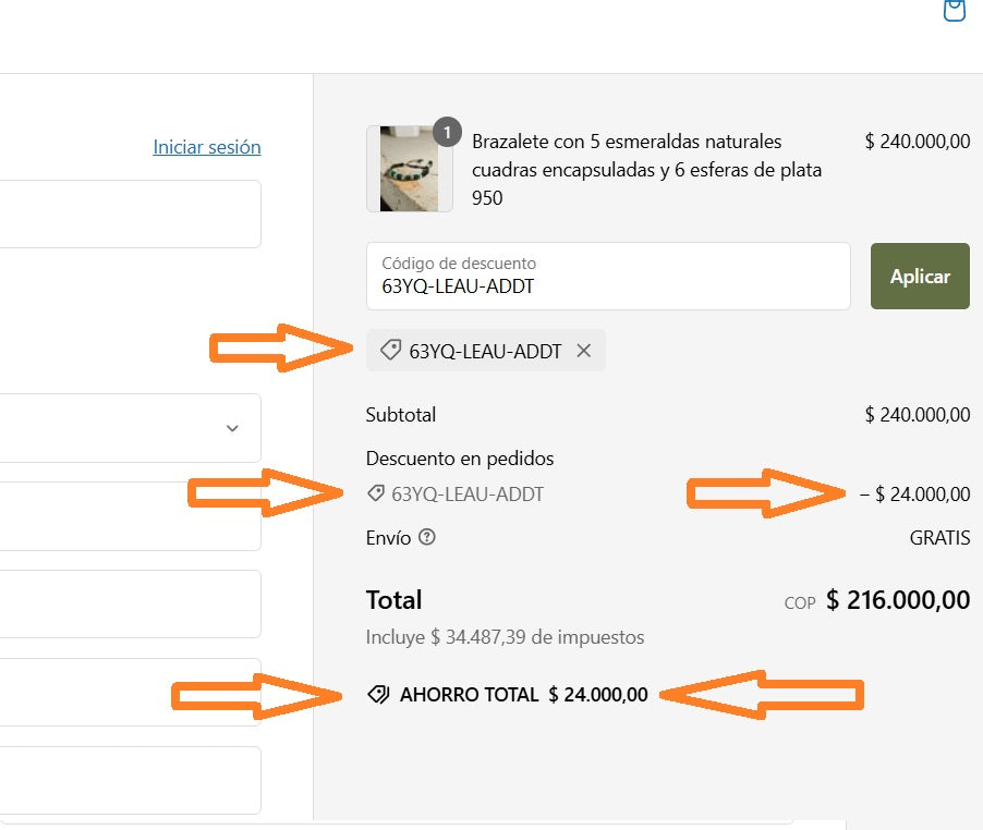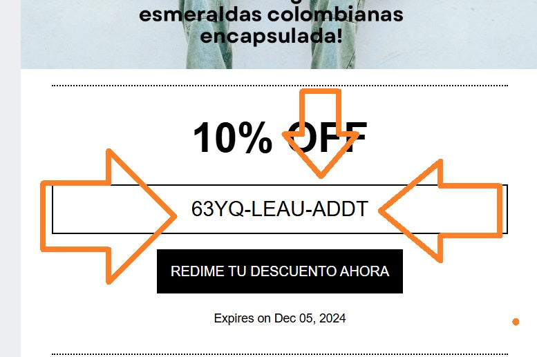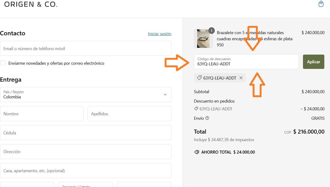 Elige tus productos, ve al checkout y pega el código alfanumérico (63YQ-LEAU-ADDT) que recibiste por correo en la casilla "Código de descuento". Luego, haz clic en "Aplicar" para disfrutar de tu beneficio.
